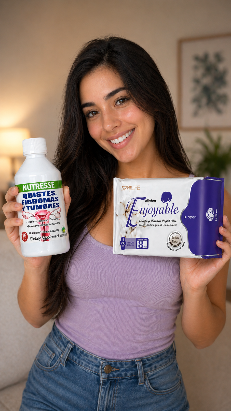 Este combo une dos fuerzas para tus noches: Nutresse, fórmula natural que reduce inflamación y equilibra tus hormonas mientras duermes, + Toallas Nocturnas Anion Enjoyable de 290 mm con tecnología aniónica que neutraliza bacterias, mantiene seca la zona toda la noche y evita las filtraciones que te roban el sueño.